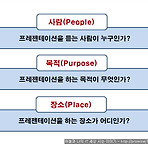 프레젠테이션을 하기 전에 이렇게 준비하라 프레젠테이션을 하기 전에 먼저 생각해야 할 것들이 있습니다. 바로 사람, 목적, 장소입니다. 세 가지 항목 - 사람, 목적, 장소 사람, 목적, 장소에 따라 프레젠테이션의 성격과 내용이 달라지게 되는데요. 첫번째로 사람(People)을 보도록 하겠습니다. 사람(People)은 프레젠테이션을 듣는 사람이 누구인가? 를 생각해 보는 것입니다. 두번째로 목적(Purpose)을 보도록 하겠습니다. 목적(Purpose)는 프레젠테이션을 하는 목적이 무엇인가를 생각해 보는 것입니다. 세번째로 장소(Place)을 보도록 하겠습니다. 장소(Place)는 프레젠테이션을 하는 장소가 어디인가를 생각해 보는 것입니다. 아래의 그림을 통해 정리해 보도록 하겠습니다. 사람(People)..