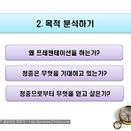 프레젠테이션 강좌 글 2011/08/15 - [지식 in | ★ 강좌 ★] - [프레젠테이션 강좌 #1] 발표를 하기 전에 이렇게 준비하라 2011/08/18 - [지식 in | ★ 강좌 ★] - [프레젠테이션 강좌 #2] 사람을 분석하라 목적을 정확히 파악하라 - 목적 분석이란? 이번 시간에는 프레젠테이션을 준비하는데에 있어 중요한 부분인 목적 분석에 대해서 알아보도록 하겠습니다. 목적분석은 무엇이냐 하면 프레젠테이션의 목적을 정확하게 파악하기 위해 하는 것이라 생각하시면 되겠습니다. 목적을 분석하기 위해서는 아래와 같이 세 가지 항목을 중점으로 생각하시면 됩니다. 예를 들어서 매출실적을 회의 때 보고한다거나, 상사에게 프로젝트 진행상황을 보고할 때는 현재까지 이루어진 사실을 전달하는 프레젠테이션이라 ..